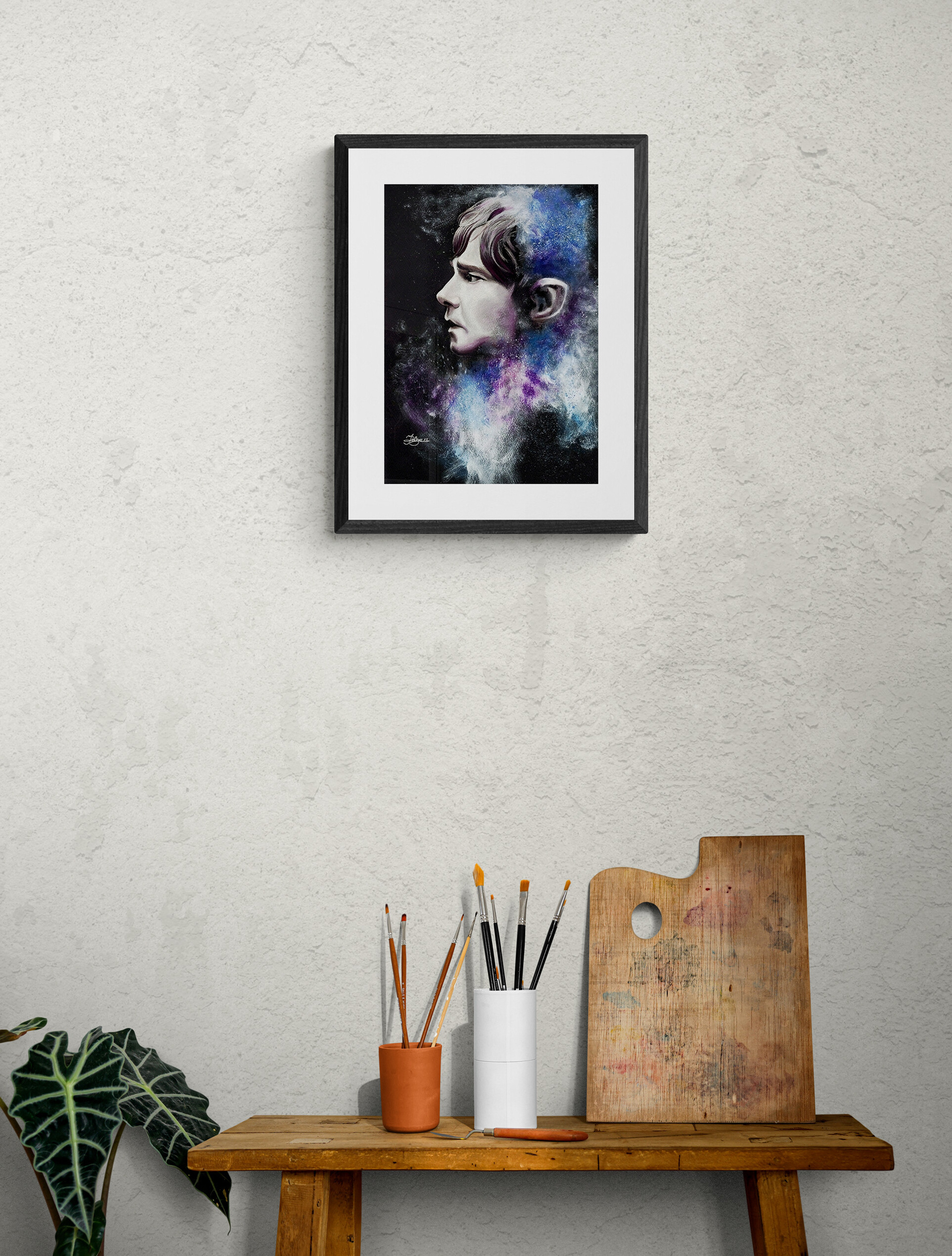 A traditional portrait painting of Martin Freeman as Bilbo from " The Hobbit". I used pastels for his face and acrylic paint for the abstract background.